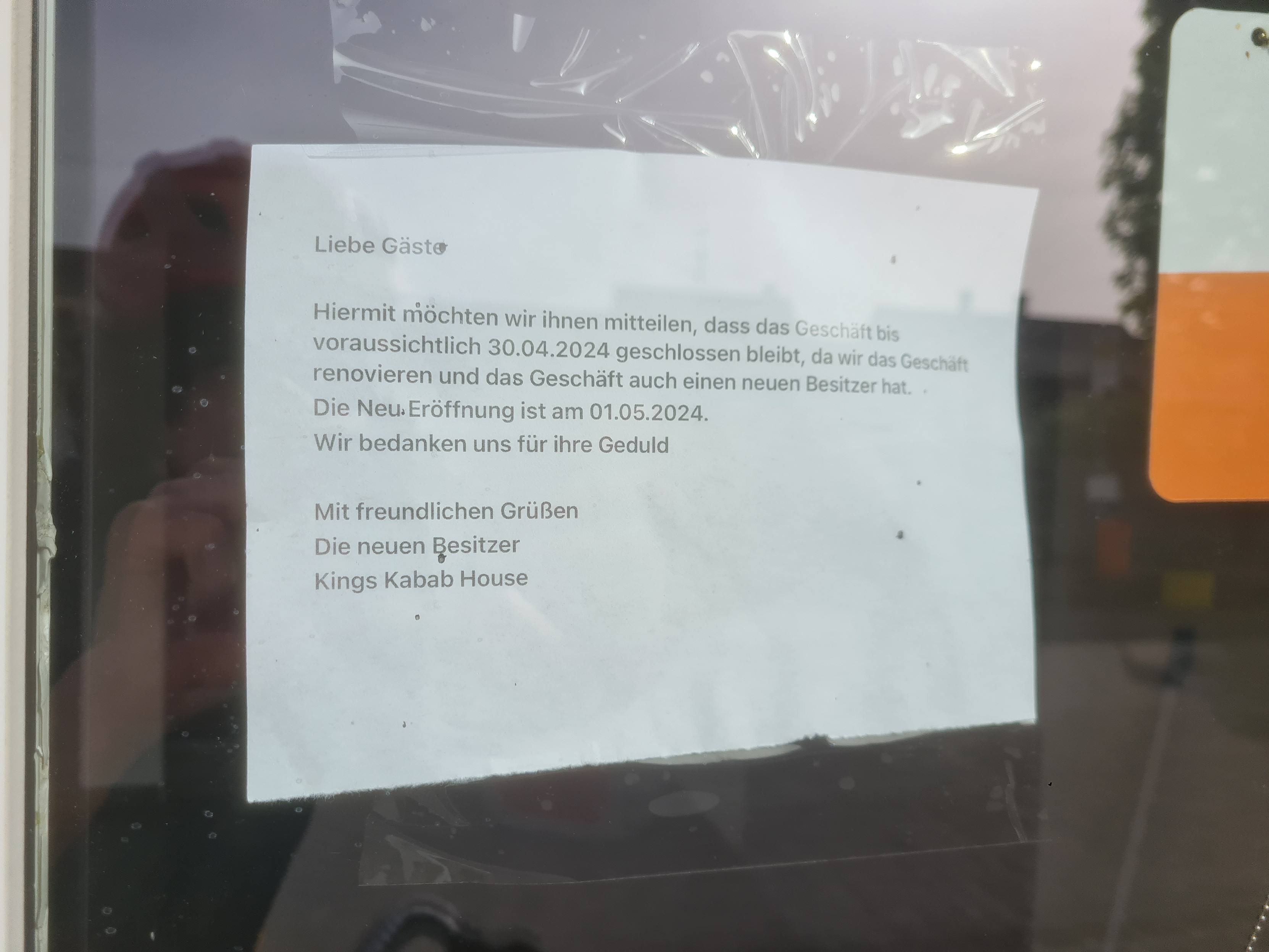 | 4187159 | Emilius123 | Hier in der Pizzeria hängt ein Zettel aus, der über eine aktuelle Phase der Geschlossenheit bis zum 1.5 und einen Inhaberwechsel zu "Kings Kabab House" informiert.. Wird also scheinbar ein Dönerladen, oder so ähnlich? Bitte im Auge behalten und Updates kommentieren. Media attachment:
