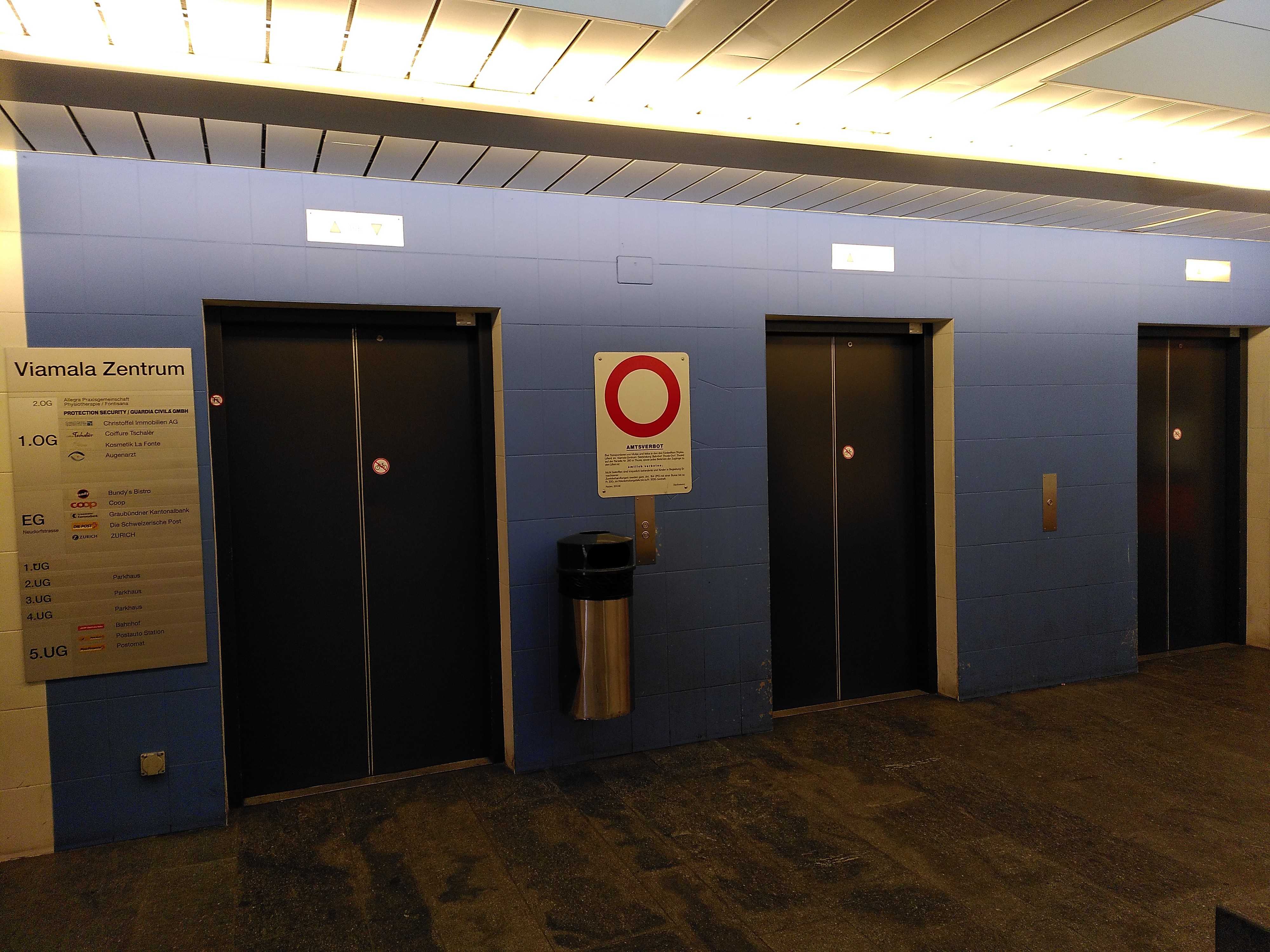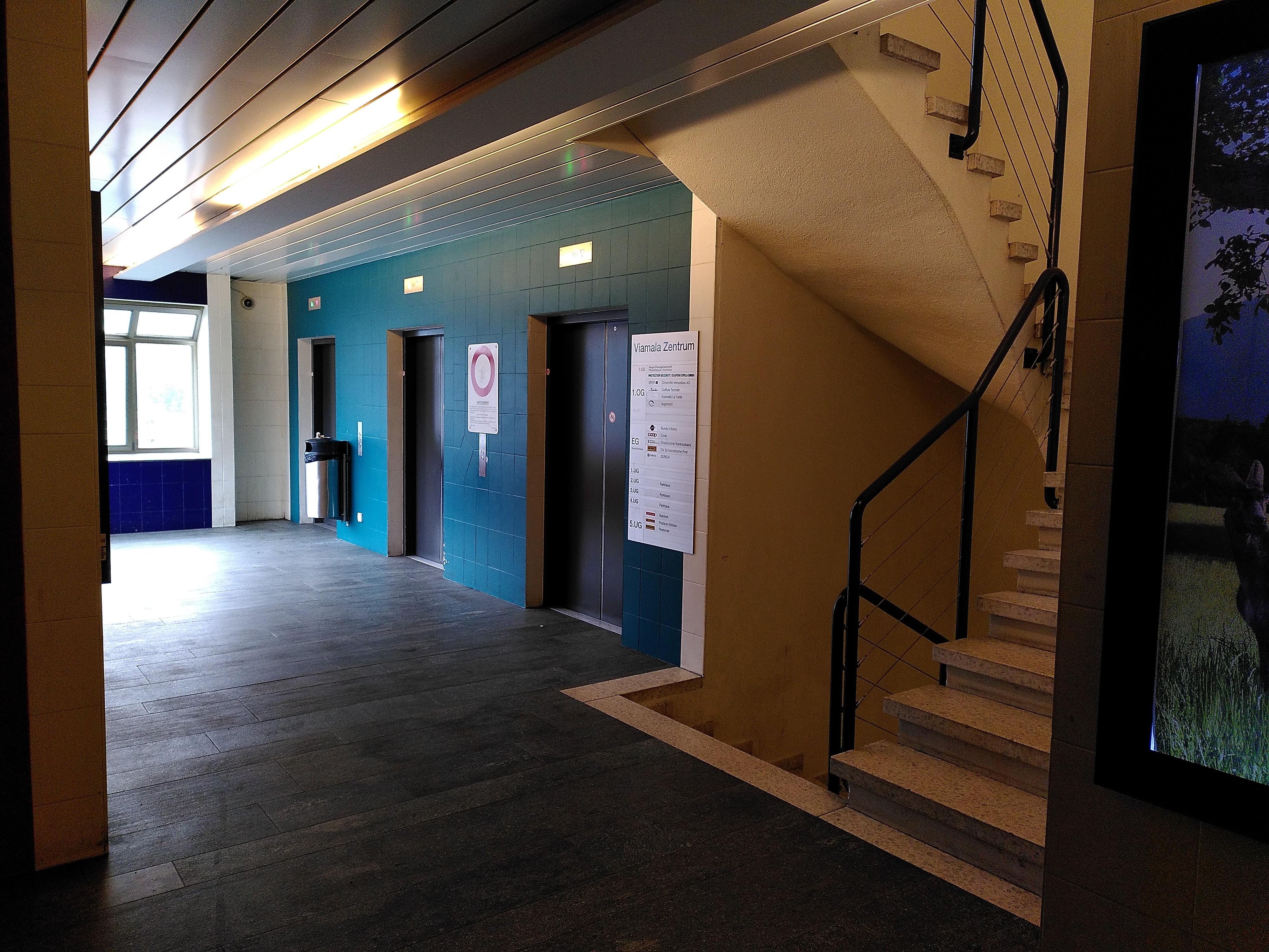 | 3336067 | Huck-Finn | As commented on the by now closed note: note/3322846 West to the 3 elevators, there is a staircase leading all the way from 1. OG to 6. UG. (the staircase goes one further down than the elevator. I assume so at least, as the assumend level "6. UG" (=basment) is not accesible to the public. The staircase is located east to the elevators from 4. UG to 6. UG EG. Viewed from roughly west. Staircase west of elevators.