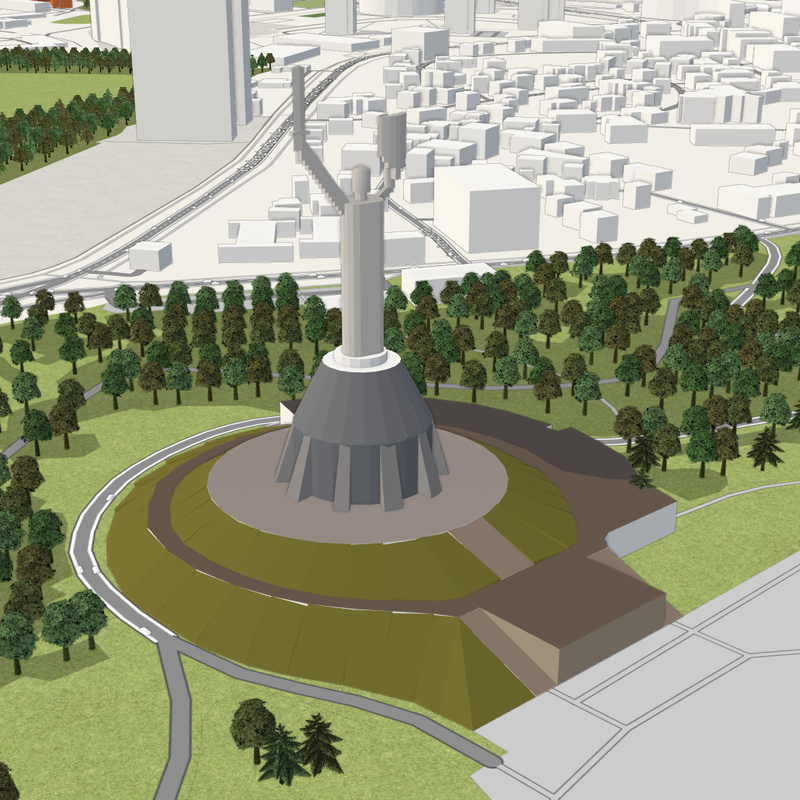 Mother Ukraine is a monumental statue constructed as a WW2 memorial. In 2023 it was modified to replace the Soviet emblem with the Ukrainian Tryzub.