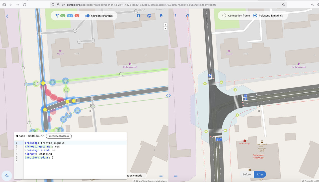 | 170505416 | 4 months ago | Hi, thank you for your feedback. Please tell me, this is very important to me and probably to many in the future. What exactly in this package of edits breaks history, any example? I made a split of roads to mark parking and correctly indicate changes in the number of lanes. The nodes themselves were all saved, only objects like way were deleted. Does it make sense to save one small old piece if we cut way into 5 small parts? What is the point of this, where can I read and find out? You can see the set of changes in more detail at this link. To see before after + diff tags of objects. Why is your answer (help maybe) important to me? Because these edits are made in a special editor, which we are preparing for publication. And if we put algorithms into it (split, for example), which violates something, then other users will start doing it too. Thank you for your help |