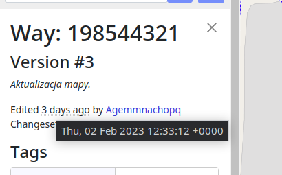 Wchodząc na adres elementu np. way/198544321 widać tę datę po najechaniu myszką: https://img.monicz.dev/-6B5pZBd9Lu