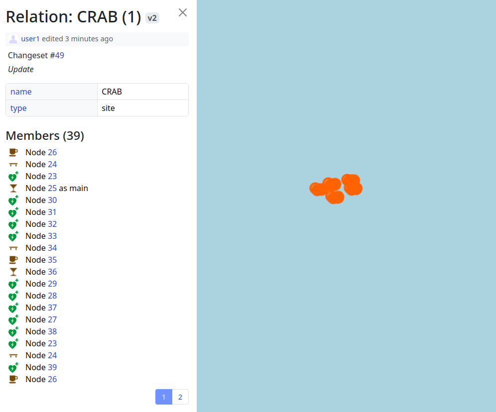 The elements sidebar has been mostly finished. The “Part of” and “Members/Nodes” sections are now more consistent in design and have received pagination support. The orange-colored map visualization is also now working.