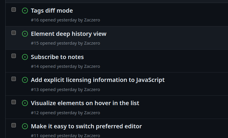 I have also publicized some collected feature ideas on the GitHub Issues tracker. These currently include only medium and long-term ideas. Short-term ideas will be added closer to this month’s deadline. Some features embedded within the code will also be added to this list soon - currently it’s not exhaustive as it covers only my personal notes.