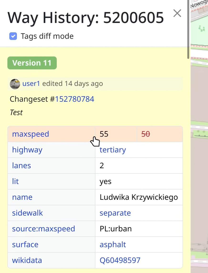 One of the main goals of the OpenStreetMap-NG project is to make moderation and changes review easier. We’re pleased to announce the new Tags Diff Mode that makes it easy to review tagging changes over time - integrated directly into the element history view. We’ll work on further expanding this functionality in the future.