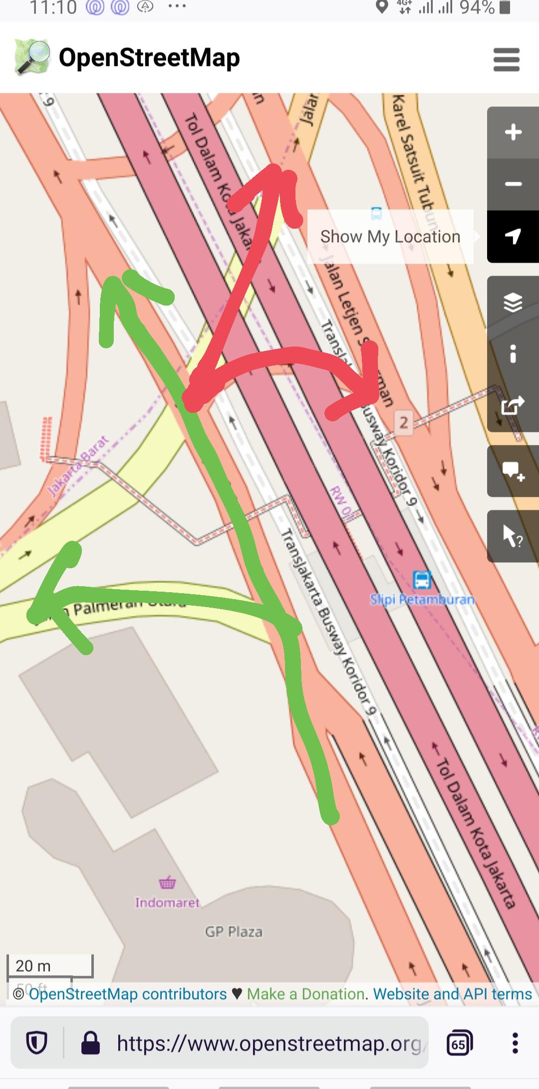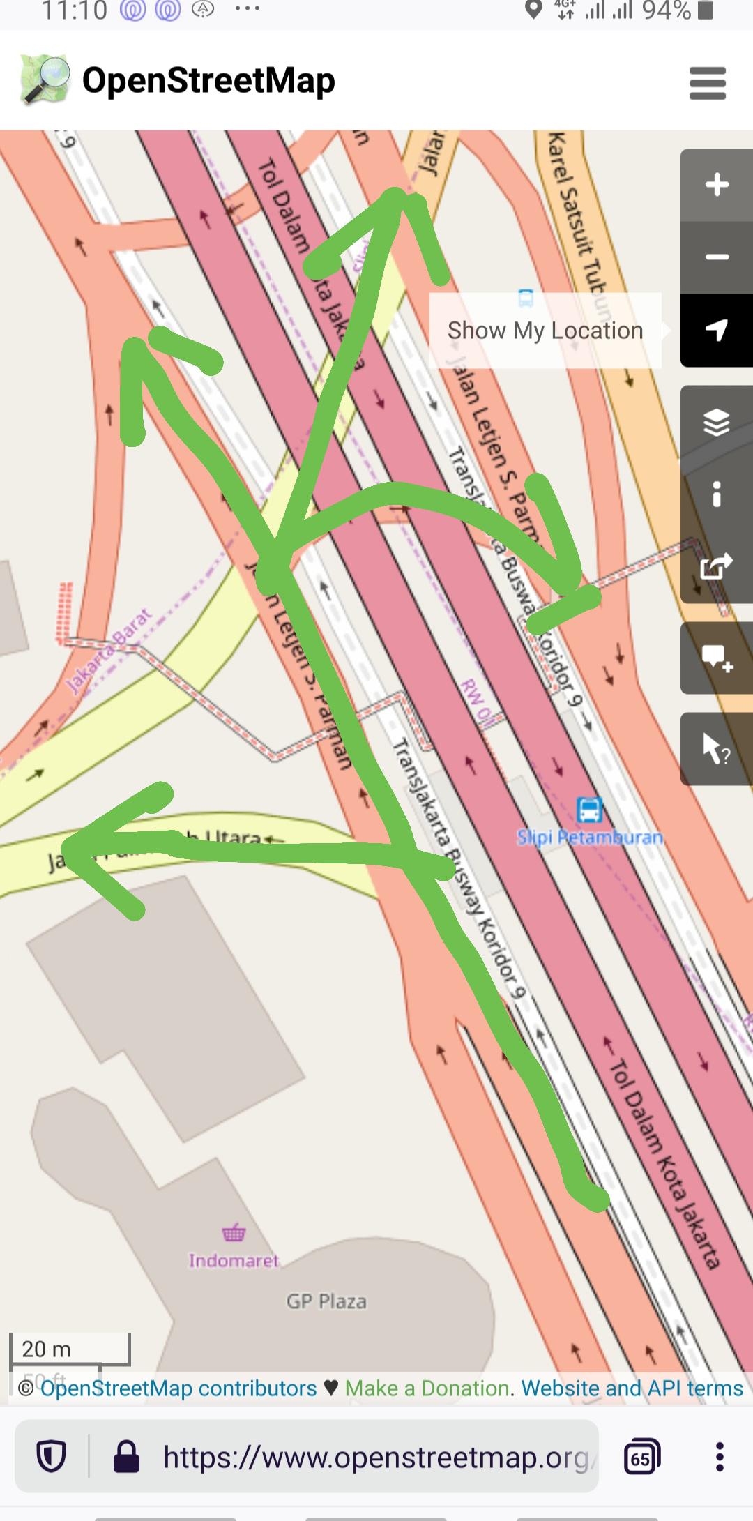 | 79355763 | almost 6 years ago | Hello,I'd like to comment on the changes of the junction of Jalan Gatot Subroto/Letjen S. Parman/Aipda KS. Tubun/Palmerah Utara streets (near the bus station "Slipi Petamburan"). The last map edit on this junction (edited by me), though geometrically incorrect, was designed to cope with a unique turn restriction that may result in fines, for vehicles moving from Jalan Tentara Pelajar as well as Jalan Gatot Subroto (from South to North). Vehicles moving from Jalan Gatot Subroto can freely choose the direction they would like to turn.  Meanwhile, vehicles from Jalan Tentara Pelajar are not allowed to take a right turn (as well as a U-turn) to Jalan Aipda KS. Tubun and Jalan Gatot Subroto.  |